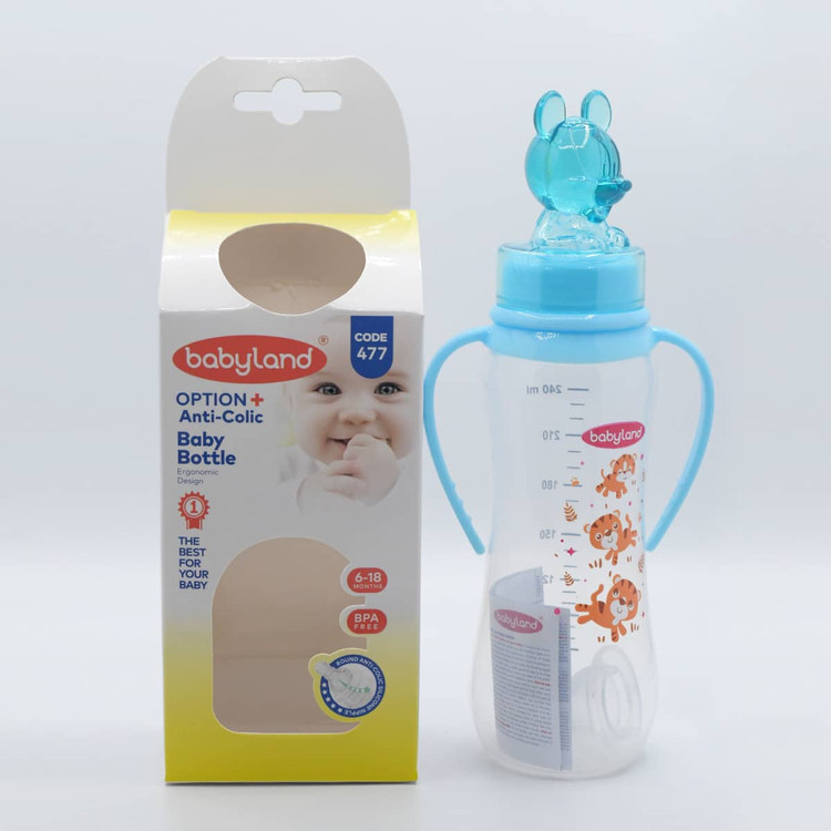 بطری شیرخوری بیبیلند کد 477 با طراحی عروسکی و ظرفیت 240 میلیلیتر، انتخابی مناسب برای تغذیه نوزادان از بدو تولد تا 6 ماهگی است. این محصول از مواد اولیه مرغوب و بهداشتی تولید شده و فاقد ترکیبات مضر مانند بیسفنول آ (BPA) است. استفاده از مواد BPA FREE در ساخت بطریهای شیر کودک، از الزامات ایمنی در تولید محصولات نوزاد به شمار میرود.