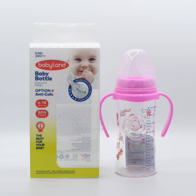 شیشه شیر پیرکس دهانه عریض بیبیلند مدل 492 – ظرفیت 240 میلیلیتر (رنگ صورتی)