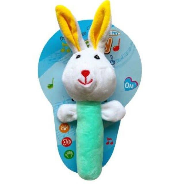 ویژگیها: دارای صدای جغجغه با فشار دست ، طراحی خرگوش با رنگهای ملایم و پاپیون پارچهای زیبا