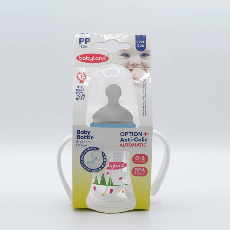 شیرخوری ضد نفخ 150 میلیلیتر دهانه عریض بیبیلند کد 356 — پلاستیک BPA Free، سرشیشه نرم — مناسب نوزادان 1 تا 4 ماهه