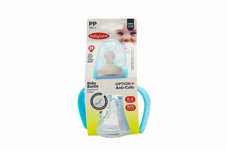 شیشه شیر ارتودنسی 150 میلیلیتر دهانه عریض بیبیلند کد 408 — طراحی دندانپزشکی، ضد نفخ، پلاستیک BPA Free — مناسب نوزادان 2 تا 4 ماهه
